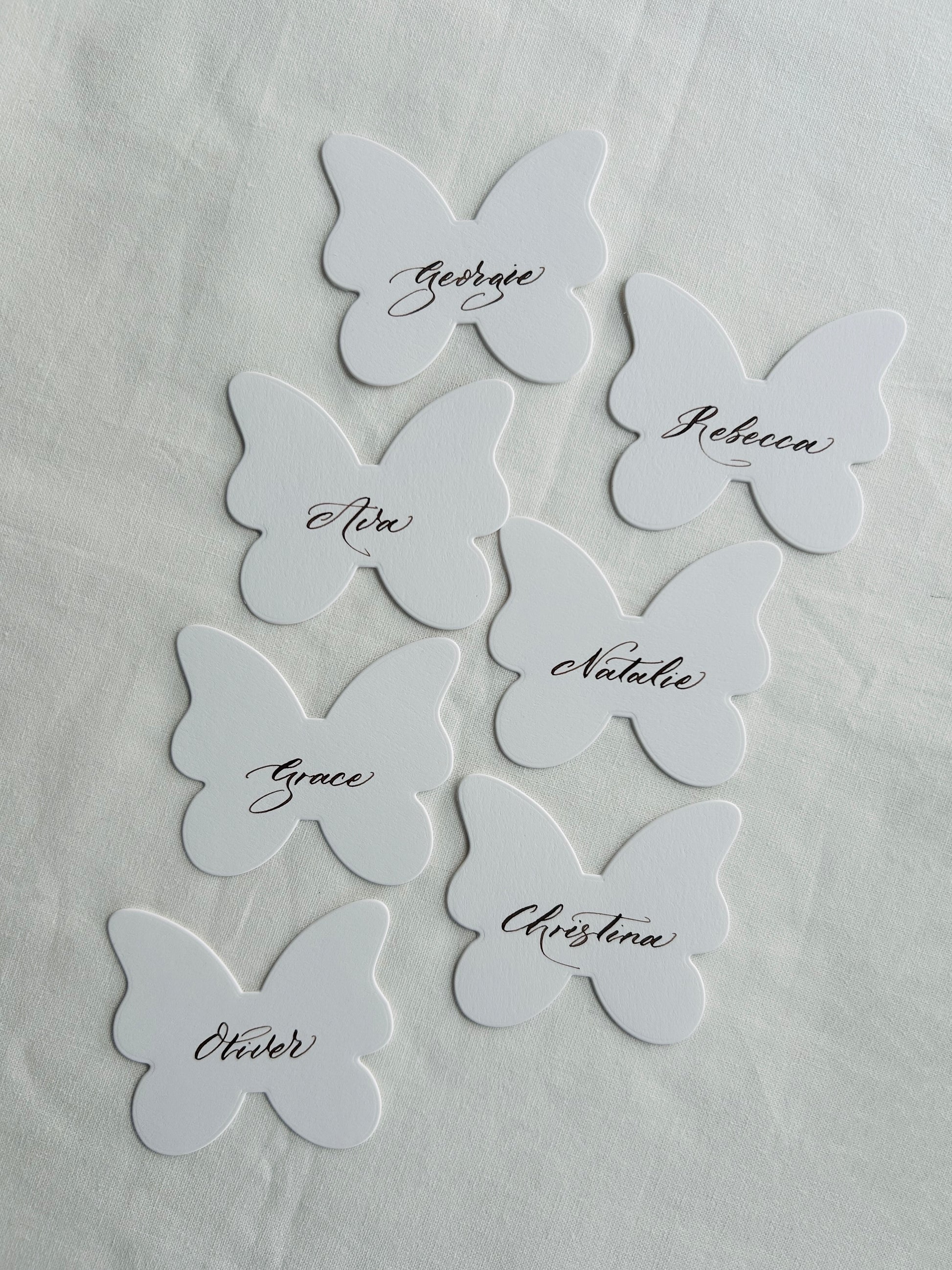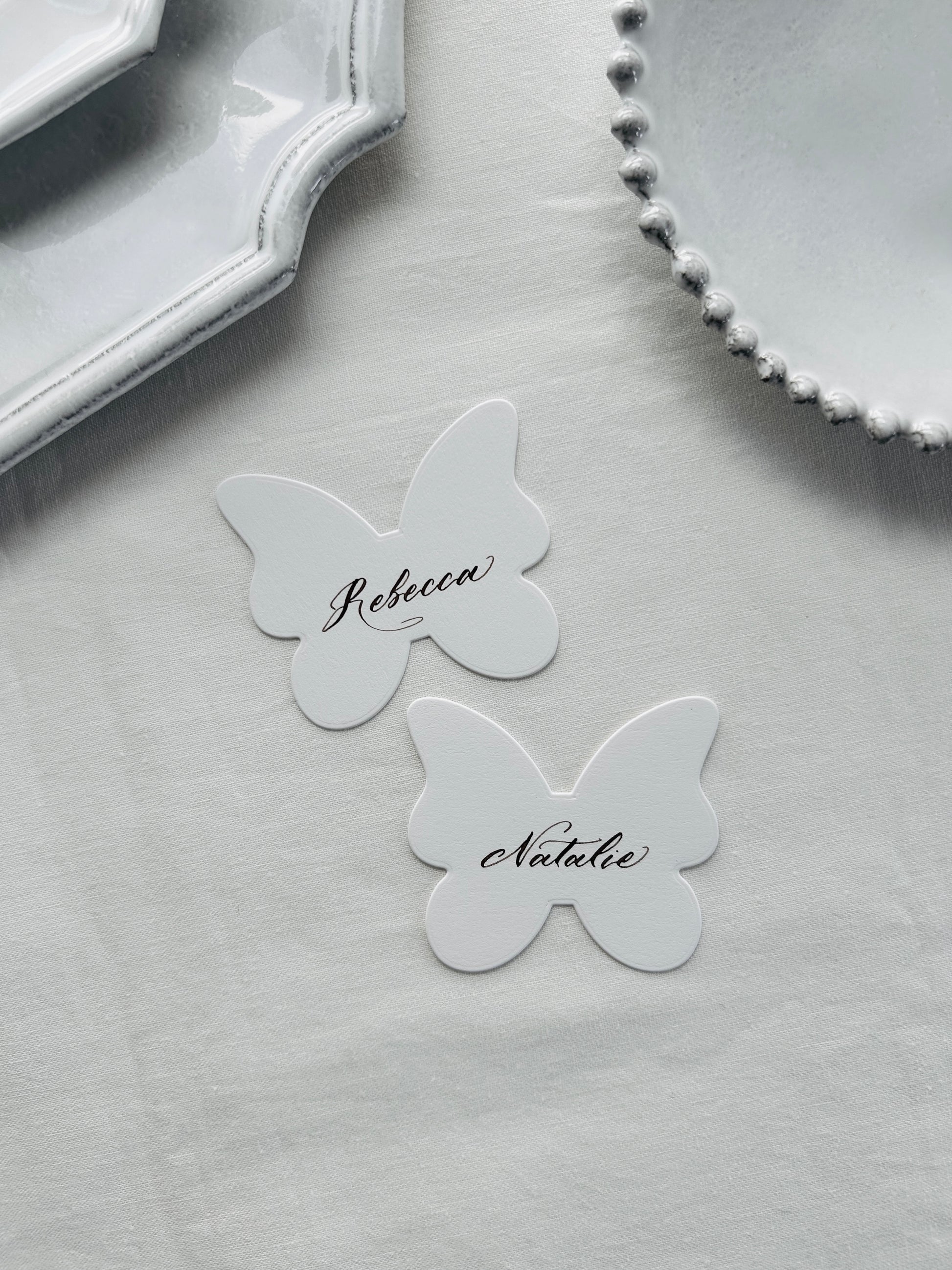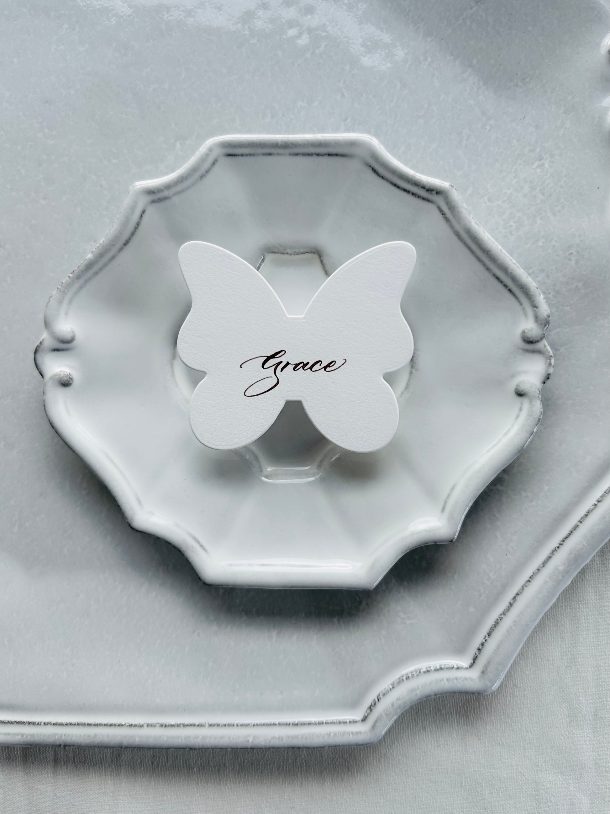 Delight your guests with a whimsical, nature-inspired touch with our Butterfly Die-Cut Place Cards. Each card is meticulously handcrafted, featuring a delicate butterfly silhouette that brings lightness and charm to your tablescape.